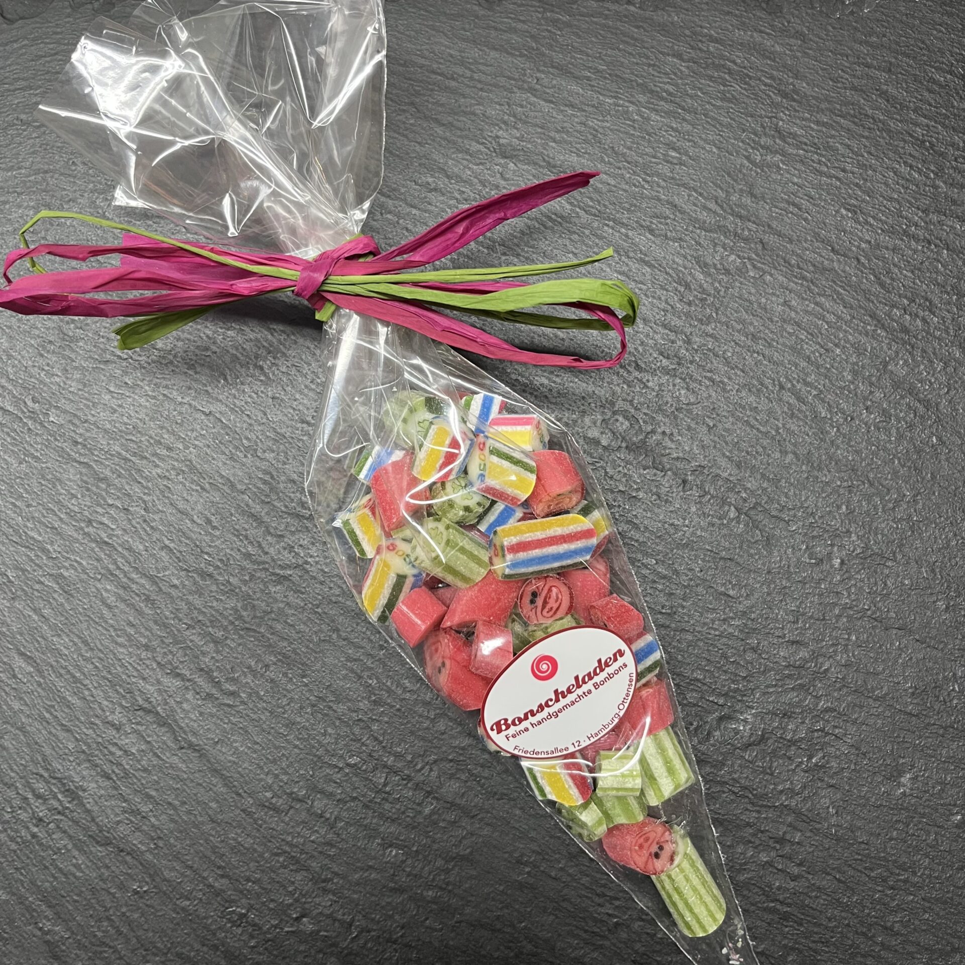 Glückwünsche zum neuen Jahr: Zitrone-Limette, Waldmeister und Süßkirsche Bonbons.